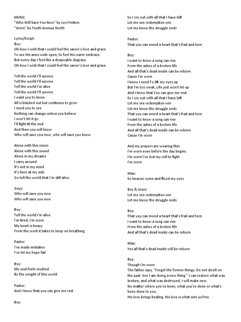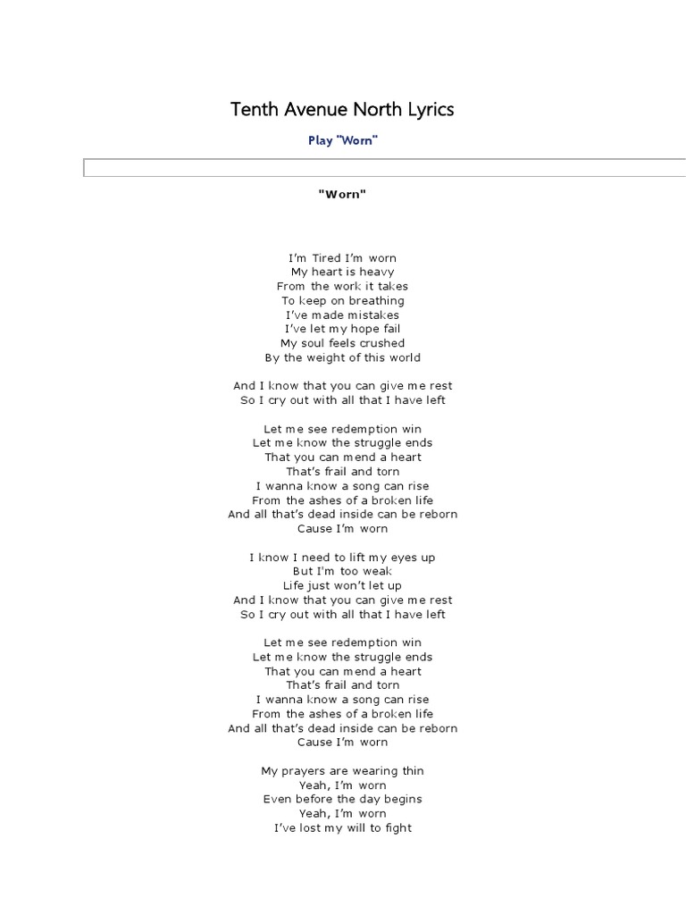 Tenth Avenue North Worn With Lyrics Youtube from i.ytimg.com We did not find results for: Check spelling or type a new query. Let me know redemption wins. Maybe you would like to learn more about one of these?